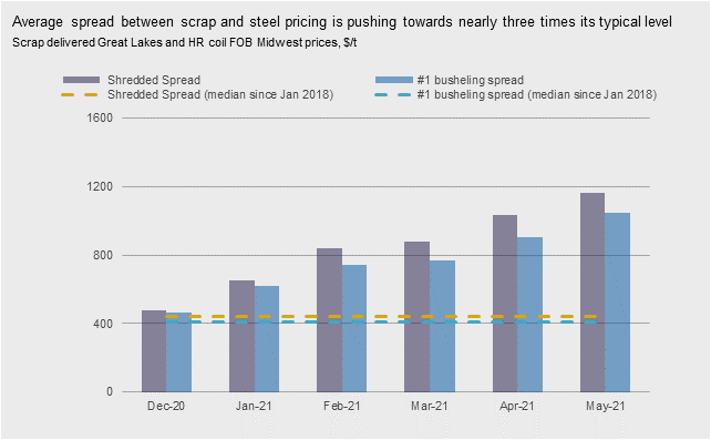“May scrap prices have essentially returned to those we saw in March, but steel prices continue to outpace this rise. In fact, we are quickly moving towards the HR coil/scrap spread expanding to three times its more normal level,” said McKinley. (See the chart below.)