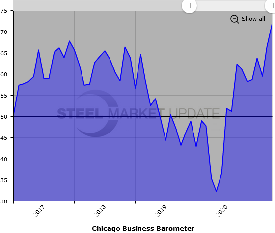 Below is a graph showing the history of the Chicago Business Barometer. You will need to view the graph on our website to use its interactive features; you can do so by clicking here. If you need assistance logging into or navigating the website, please contact us at info@SteelMarketUpdate.com.