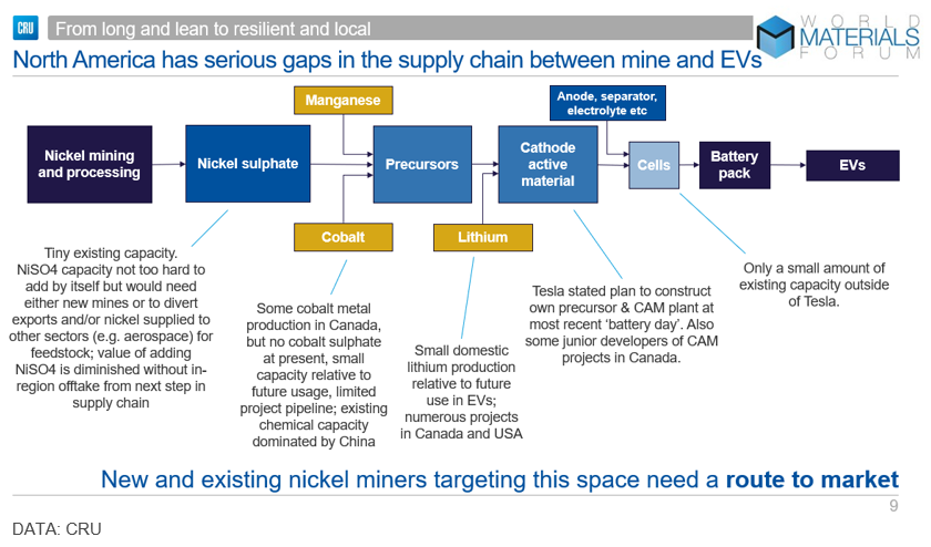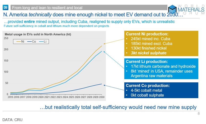 If we set this demand against current mine production in the region, we can see that nickel production in the whole of North America is about 245,000 t/y, but that includes Cuba. Excluding the embargoed material from Cuba, we are down to 185,000 t/y. Some of this material is exported in the form of intermediates, leaving just 130,000 t/y of finished nickel. And, of that, only 3,000 t is converted into nickel sulphate, which is the form required for batteries.