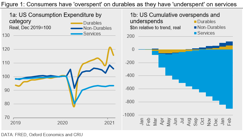 As the pandemic hit, consumer spending initially fell across all categories. As highlighted in our previous analysis, “Five features of the pandemic recovery,” spending on durables quickly recovered, and then exceeded, the pre-crisis trend. In contrast, spending on services has remained depressed (Figure 1a). A reversal of these trends presents a risk to demand for durables, the most commodity-intensive part of consumer spending.