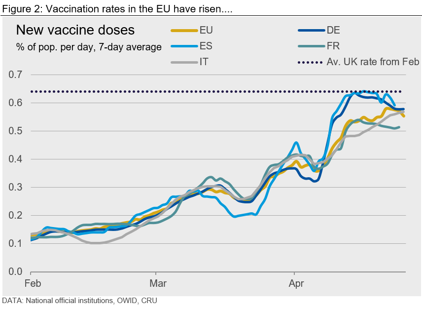 Vaccination programs in the UK and U.S. are proceeding rapidly. Vaccination has been slower to get off the ground in EU countries, initially due to later regulatory approval, more recently due to problems with vaccine supply. April was the month when an increase in supply was expected to finally boost the speed of the rollout. Data in the past few weeks has confirmed this: Germany and Spain have sharply increased the speed that vaccines are being administered, with France and Italy also seeing increases (Figure 2).