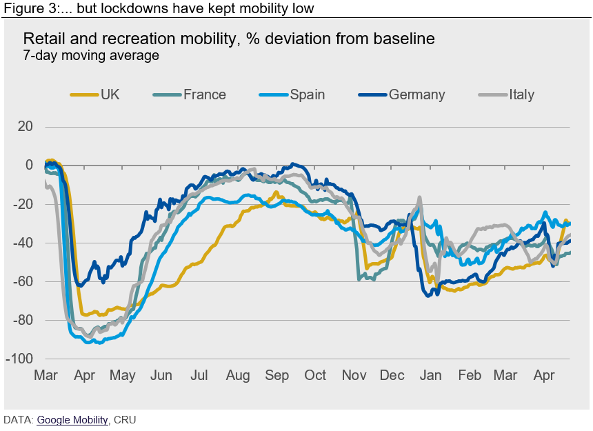 However, in the short term the outlook for Europe has worsened. The increase in vaccination rates in the past few weeks has come too late to prevent a third wave, and many European countries have tightened restrictions. This has prevented mobility from recovering to the levels of last summer (Figure 3), so the rebound in economic activity will be delayed. Our revised expectation is that “lockdown” restrictions will begin to ease from mid-May (although this will vary from country to country). At this point, if the current pace of vaccinations is maintained, the EU will have administered doses equal to around 40% of the population (the proportion of the population inoculated with at least one dose will depend on the dosing regime). By the end of Q2, this should have risen to over 60% of the population, potentially more if the Johnson & Johnson vaccine is successfully rolled out.