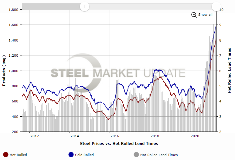 Hot-rolled coil lead times are nearly 10 weeks, double what they were in September and triple what they were a year ago.