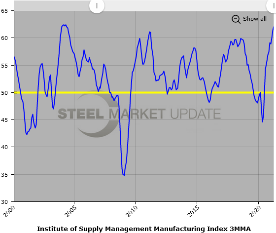 Below is a graph showing the history of the ISM Manufacturing Index. You will need to view the graph on our website to use its interactive features; you can do so by clicking here. If you need assistance logging in to or navigating the website, please contact us at info@SteelMarketUpdate.com.