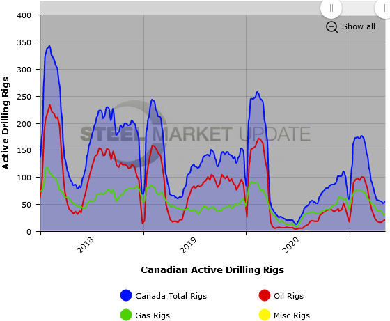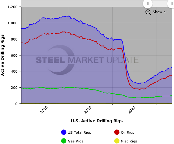 The number of active oil and gas drill rigs increased this past week for both the United States and Canada, according to data released by oilfield services company Baker Hughes. The rig count is important to the steel industry because it is a leading indicator of oil country tubular goods demand.