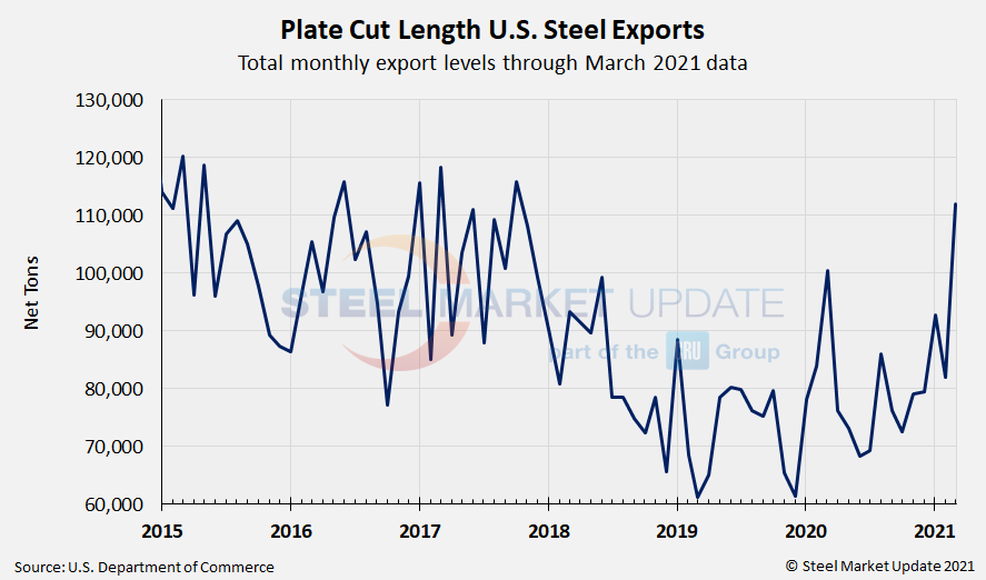 Cut plate exports were up 37% from February to 112,056 tons, up 12% compared to one year ago. Click here to view a graph showing the growth in cut plate exports.