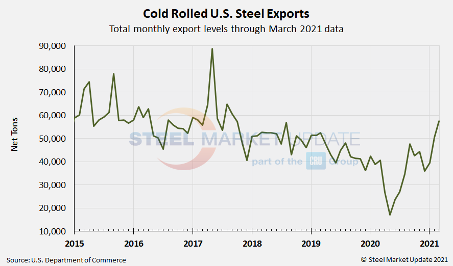 Exports of cold rolled products were 57,533 tons in March, up 14% from February, and up 41% from the same time last year. Click here to view a graph showing the growth in cold rolled exports.