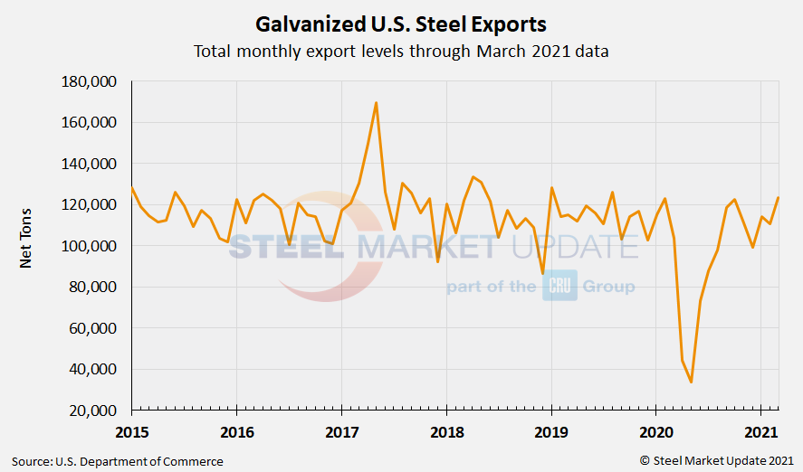 Galvanized exports increased 12% month over month to 123,584 tons. Compared to levels one year ago, March was up 19%. Click here to view a graph showing the growth in galvanized exports.
