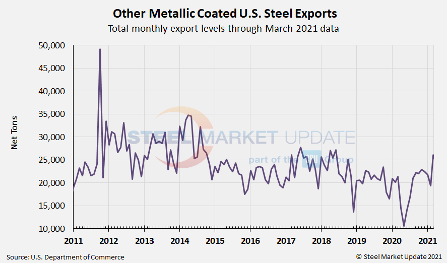 Exports of all other metallic coated products were 26,144 tons, up 35% from February, and up 22% year-over-year. Click here to view a graph showing the growth in other metallic coated exports.