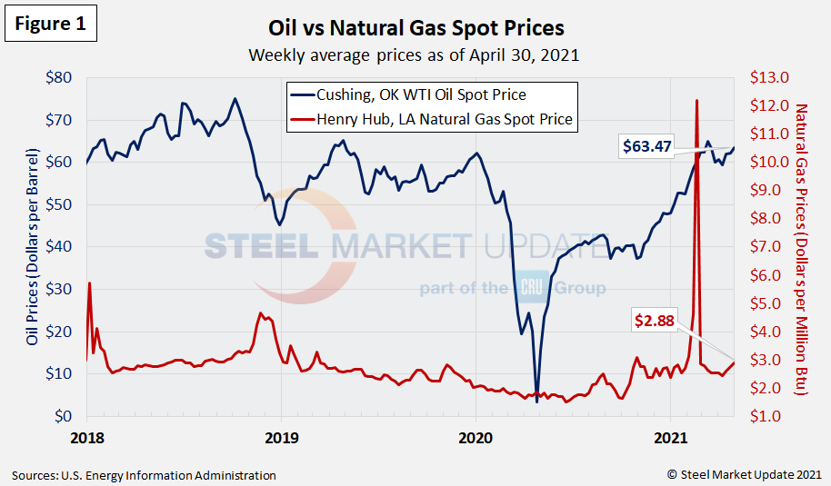 The spot market price for West Texas Intermediate (WTI) has rebounded since our last energy update, at $63.47 per barrel as of April 30. Natural gas prices at the Henry Hub in Oklahoma are now up to $2.88 MMBTU (million British Thermal Units) as of April 30. The market has adjusted from the mid-February spike when winter storms impacted much of the nation and the scarcity of natural gas and rising demand drove spot prices through the roof. Figure 1 shows the weekly average spot prices for each product.
