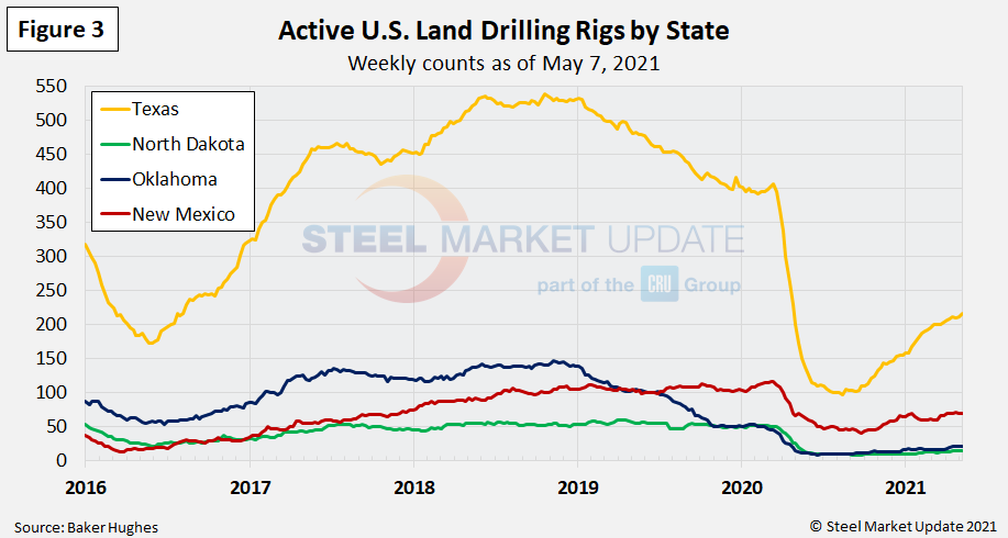 U.S. oil and gas production are heavily concentrated in Texas, Oklahoma, North Dakota and New Mexico, which have all seen declines of 40-70 percent since March of last year. The most active state, Texas, now has 216 active rigs in operation, the highest level seen since April 24, 2020. Texas rigs had plummeted from 407 in March 2020 to 97 rigs in August 2020 (Figure 3).
