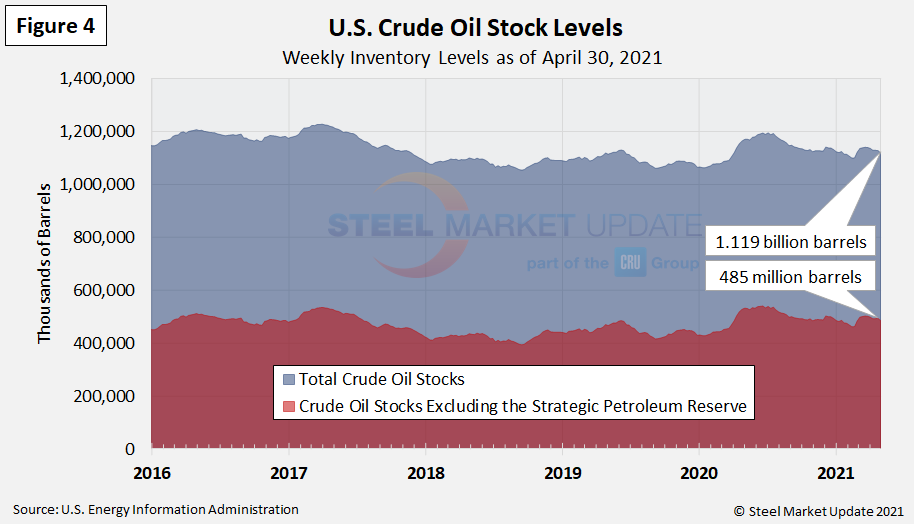 U.S. total crude oil stocks in 2020 had surged from mid-March through July, but have steadily declined since then. The latest level is down compared to our last update to 1.119 billion barrels as of April 30, down from 1.170 billion barrels at the same time last year (Figure 4).