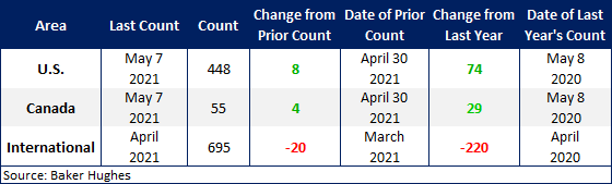 The number of active U.S. oil and gas drill rigs has continued to recover since mid-2020, up to 448 active drill rigs as of last Friday. That total is comprised of 344 oil rigs, 103 gas rigs and 1 miscellaneous rig, according to the latest data from Baker Hughes (Figure 2). While up over recent months, active drill rigs are still down 44 percent from the March 2020 level of 793 rigs, just prior to the coronavirus shutdowns. The table below compares the current U.S., Canada and International rig counts to historical levels.