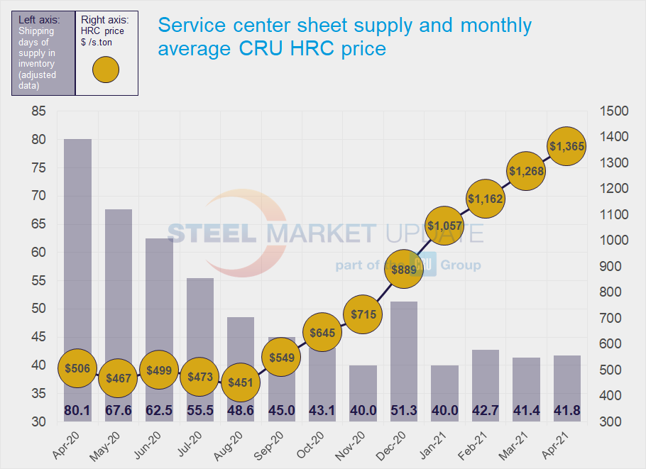 As prices reach new highs, service centers have increased the amount of inventory tied to contracts, Service center flat rolled inventories tied to contracts have been about 60% for the last three months, up from 54.5% in April 2020.