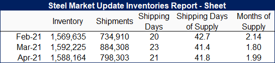 U.S. service center flat rolled inventories remain low, though steel mills are starting to catch up on delayed orders. Service centers carried 41.8 shipping days of supply at the end of April, flat compared to March’s adjusted inventory of 41.4 days of supply. April inventories represented 1.99 months of supply, up from 1.8 in March.