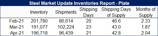 Service center plate inventories remained flat in April with 42.8 shipping days of supply. In March, service centers carried 43 shipping days of supply. Months of supply rose to 2.04 months in April from 1.87 months in March.