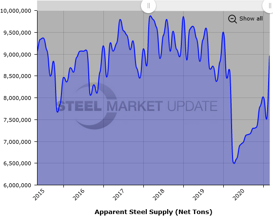 To see an interactive graphic of our Apparent Steel Supply history (example shown below), visit the Apparent Steel Supply page in the Analysis section of the SMU website. If you need any assistance logging into or navigating the website, contact us at info@SteelMarketUpdate.com.