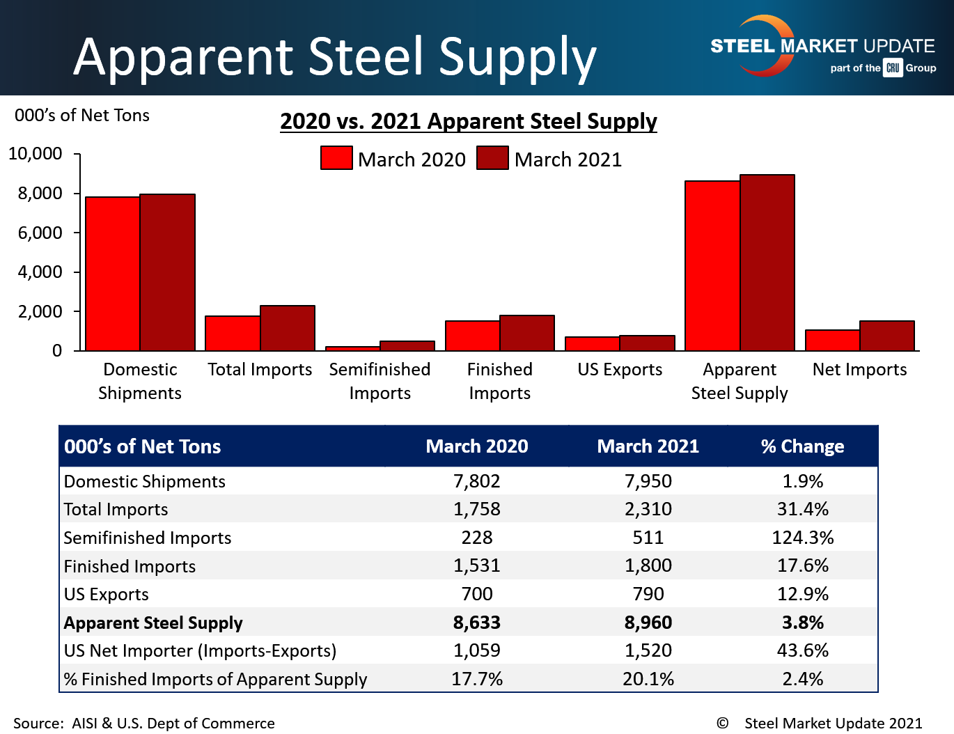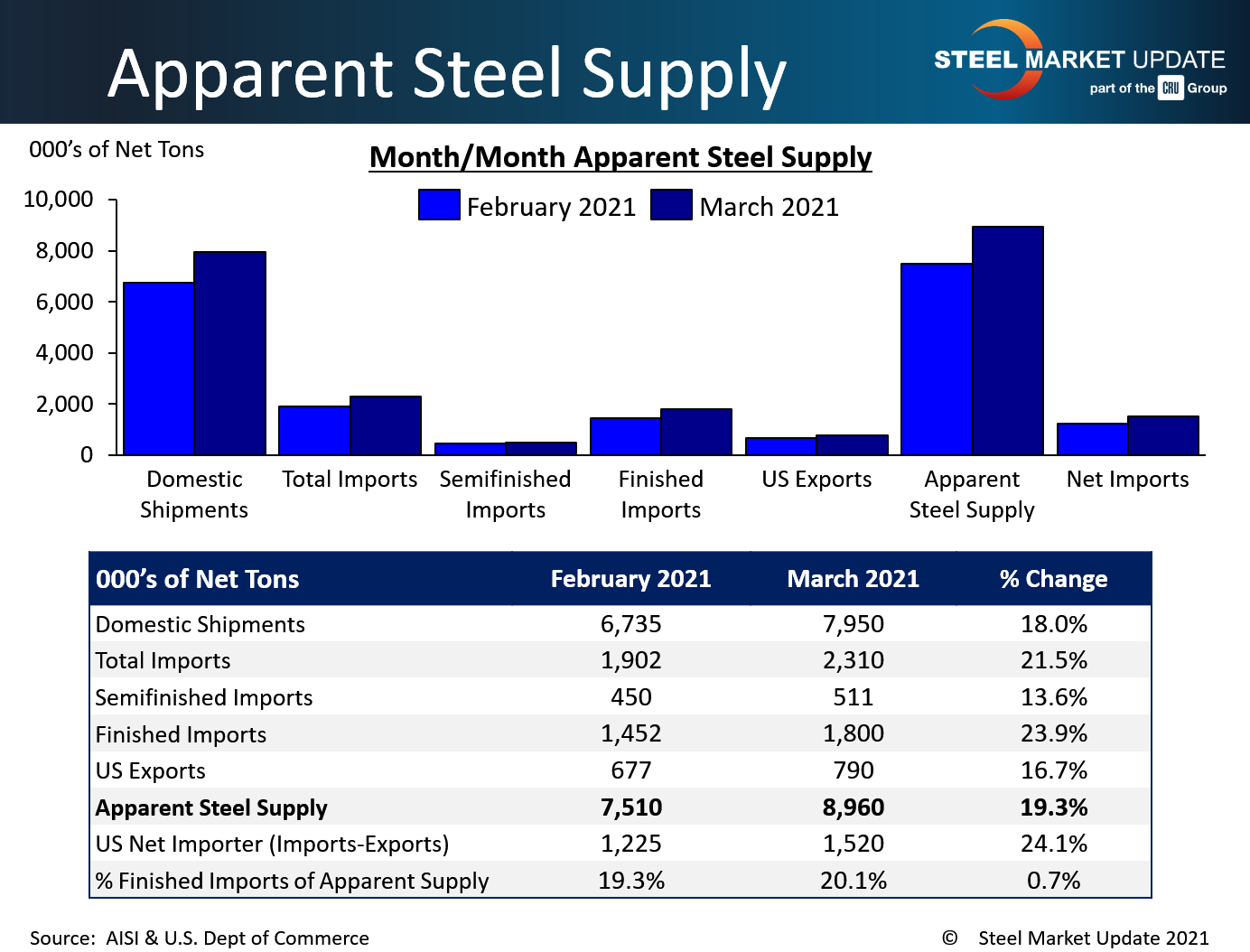 March apparent steel supply rose nearly 1.5 million tons from February’s dip, now at 8.96 million net tons, according to the latest U.S. Department of Commerce and American Iron and Steel Institute data. This is the highest supply level seen since January 2020’s 9.52 million tons. March also marks the largest month-over-month increase in supply seen in 11 years, going back to March 2010 when supply jumped 22.6% or 1.50 million tons. Aside from the February 2020 slip, apparent supply has increased each month since April 2020. Recall that April and May of 2020 were the two lowest levels seen in the last 10 years at 6.53 million tons and 6.60 million tons, respectively. March supply is up 327,000 tons compared to the same month in 2020.