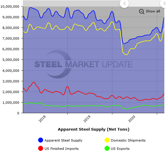 Apparent steel supply, a proxy for demand, is determined by combining domestic steel mill shipments and finished U.S. steel imports, then deducting total U.S. steel exports.