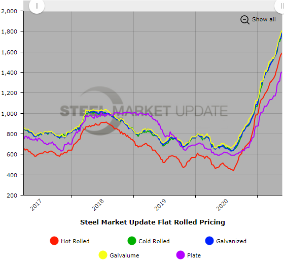 SMU Note: Below is a graphic showing our hot rolled, cold rolled, galvanized, Galvalume and plate price history. This data is available here on our website with our interactive pricing tool. If you need help navigating the website or need to know your login information, contact us at info@SteelMarketUpdate.com.