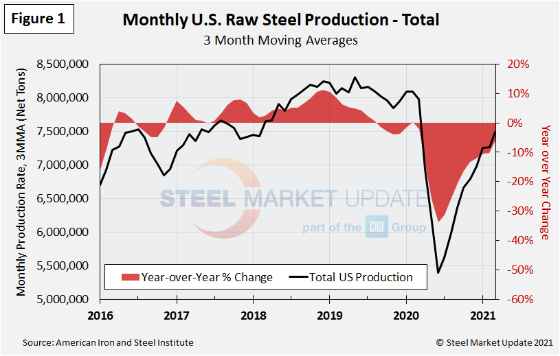 U.S. raw steel production in March increased nearly 870,000 tons or 12.5% from February, reaching 7.83 million net tons, according to recently released American Iron and Steel Institute data. March marks the highest production level seen since January 2020 when 8.44 million tons were produced by domestic mills. March production is up 120,000 tons or 1.6% compared to the same month last year.
