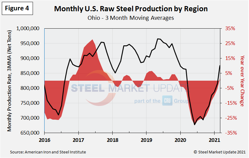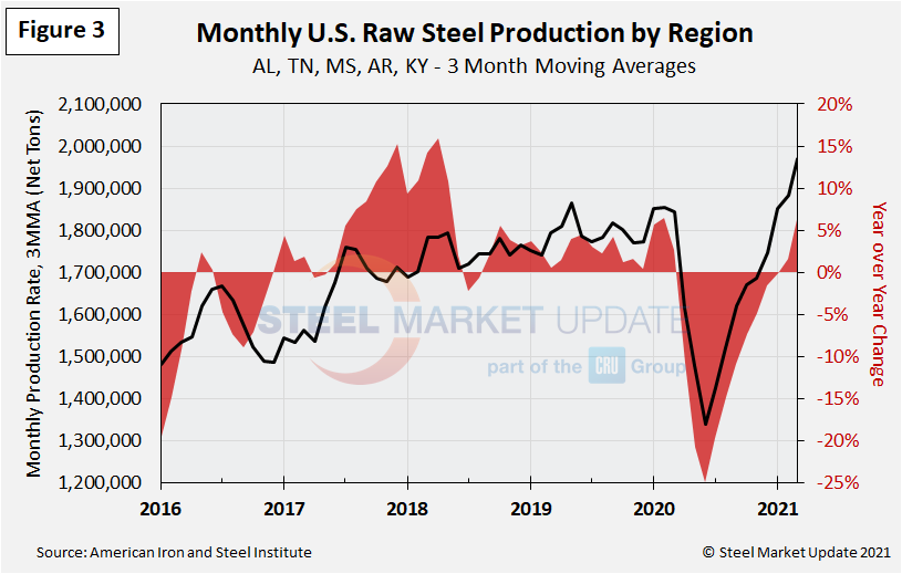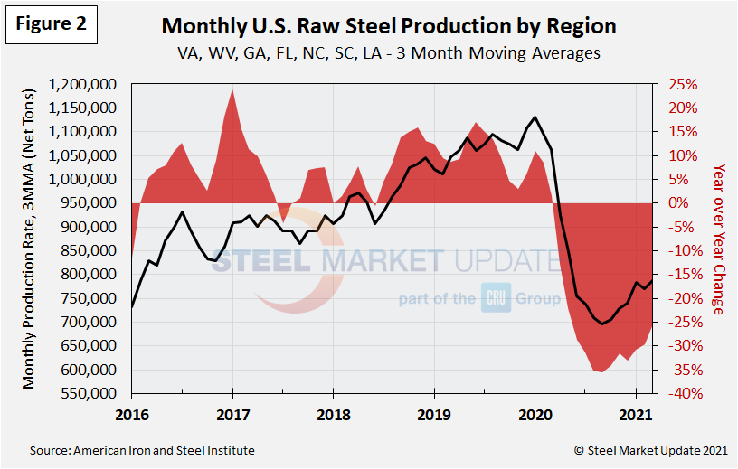 SMU is now publishing regional steel production data for the four regions responsible for 10% or more of total domestic production; Figure 2 shows 3MMA production history from the combined states of Virginia, West Virginia, Georgia, Florida, North Carolina, South Carolina and Louisiana. The latest 3MMA for March is 787,000 tons, the highest level since May 2020, but down 26% compared to the same period in 2020.