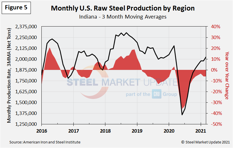 Figure 5 shows the 3MMA production levels from the state of Indiana through March. Produciton is now at 2.02 million tons, the highest production rate in 12 months. March 2021 production was down 5.9% compared to March 2020.
