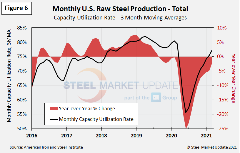 On a 3MMA basis, the capacity utilization rate through March increased to 77.1%, down 2.3% compared to the same period one year prior. As shown in Figure 6, this rate has increased each month since the June 2020 low of 55.6%.