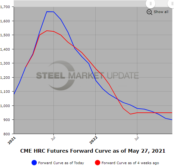 We can see this volatility in the price movement in Q3’21 and Q4’21 for the period from May 13 through yesterday, May 26, as reflected by settlement values. Q3’21 HR settlement values during this period declined $162/ST and then rose $188/ST to settled yesterday at $1593/ST. However, Q4’21 HR settlement values during this period declined $207/ST and then only rose $127/ST to settle yesterday at $1,337/ST, which has left the forward curve more steeply backwardated.