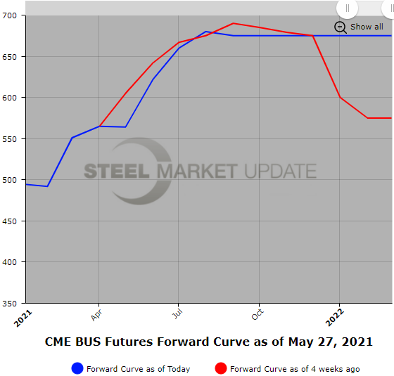 Increasing prices for obsolete and alternatives have kept the Jun’21 BUS futures well bid. Current market for the front month, Jun’21 BUS is $600/$620 per gross ton, which matches up nicely with the current chatter, which suggests that June No. 1 Busheling delivered Midwest will be up roughly $50/GT. 2H’21 BUS has been settling at about $675/GT. Rising pig iron prices along with rising obsolete export prices are shifting the focus back onto BUS, which is reflected in the higher 2H’21 BUS bids.