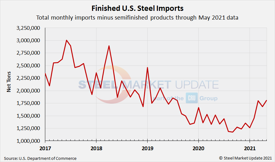 Total finished steel imports were 1.68 million tons in April, down 7% from March’s 19-month high. Finished steel import licenses for May are currently at 1.80 million tons, a bounce back from April’s dip, and could potentially be the highest level since July 2019.