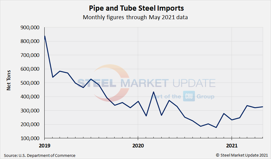 The two charts below show monthly imports grouped by product category: flat rolled imports and pipe and tube imports. Both product groups declined in April, with flat rolled imports down 10% from the month prior and pipe and tube imports down 4%. Looking through May data, each product group has rebounded a bit; current license data suggests a 10% rise in flat rolled imports and a 2% increase in pipe and tube imports over April.