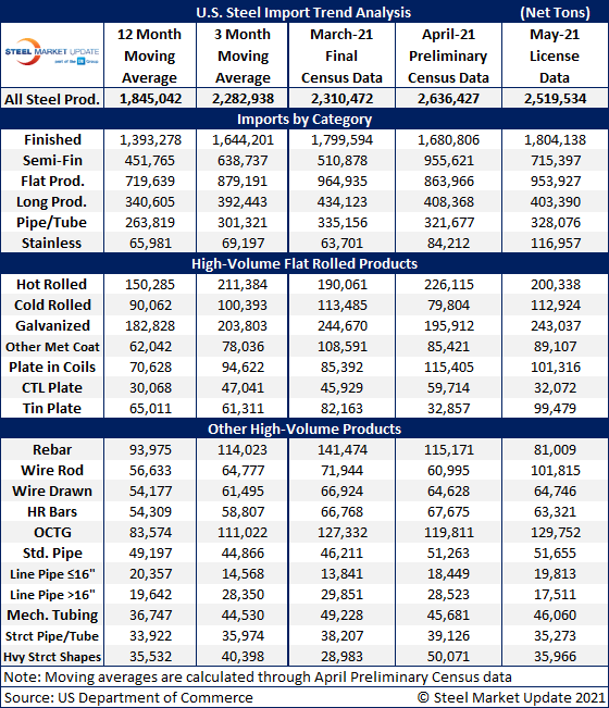 Due to large month-to-month swings in semifinished imports, the chart below shows total monthly imports on a three-month moving average (3MMA) basis in an attempt to more accurately display the U.S. steel import trend. The 3MMA through preliminary April import data is 2.28 million tons, up from 2.21 million tons in March and up from 1.94 million tons in January. The lowest 3MMA level in our recent history was October 2020 at 1.36 million tons. The April 3MMA is now the highest seen since September 2019.