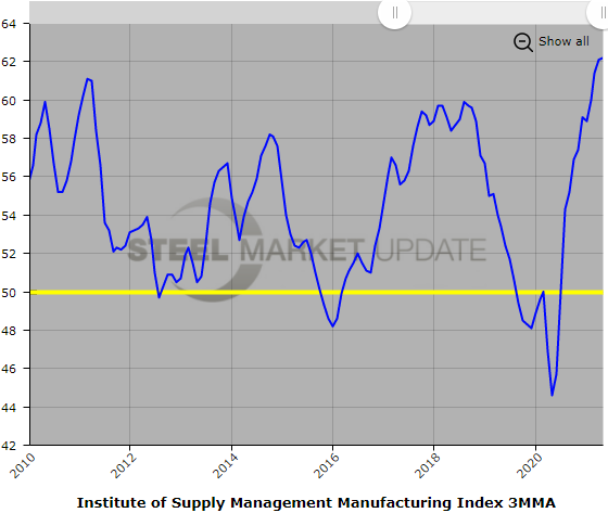 Below is a graph showing the history of the ISM Manufacturing Index. You will need to view the graph on our website to use its interactive features; you can do so by clicking here. If you need assistance logging into or navigating the website, please contact us at info@SteelMarketUpdate.com.