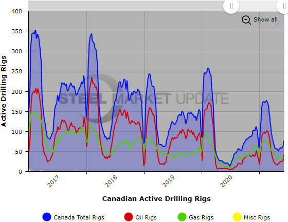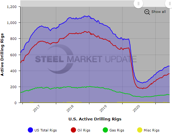 The number of active oil and gas drill rigs decreased this past week for the United States, while the Canadian rig count jumped 24%, according to data released by oilfield services company Baker Hughes. The rig count is important to the steel industry because it is a leading indicator of oil country tubular goods demand.