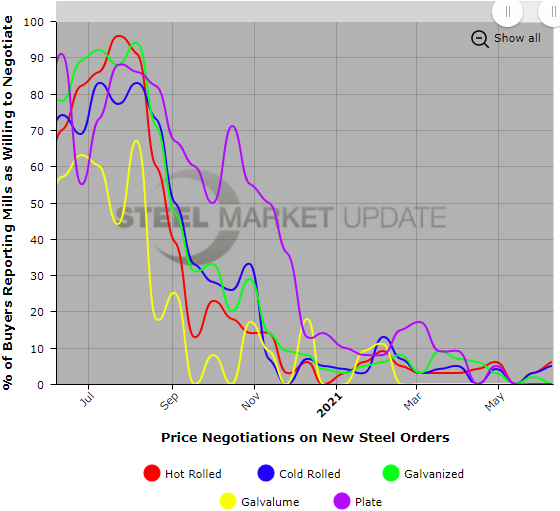 When we look at negotiations by product, we found 94 percent of our hot rolled respondents reporting no ability to negotiate with their steel mill suppliers. Cold rolled was 95 percent reporting no ability to negotiate. Galvanized, Galvalume and plate steel buyers were unanimous (100 percent) that there was no ability to negotiate spot pricing with their steel mill suppliers.