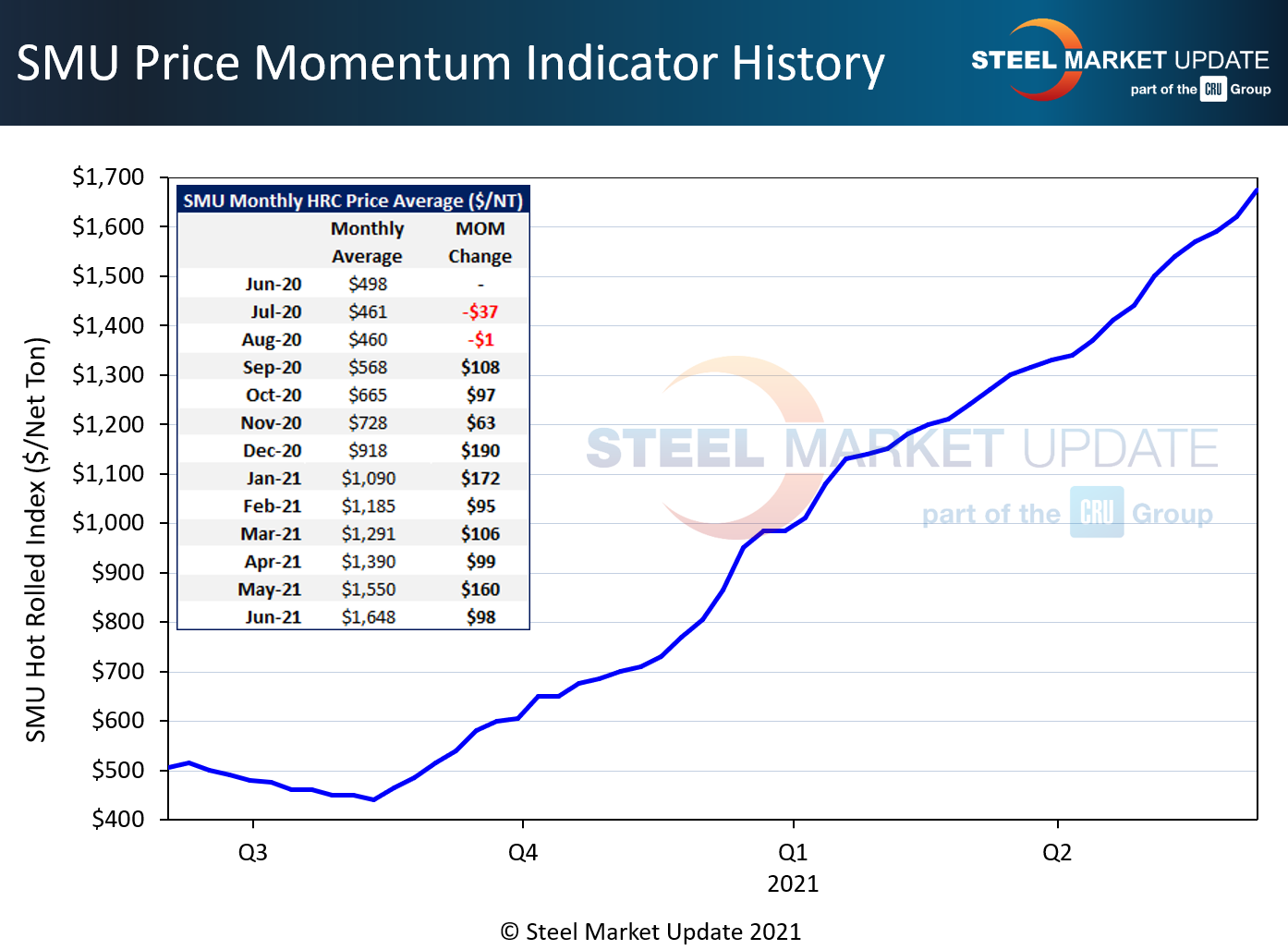 HRC prices bottomed during August 2020 as the economy quickly bounced back after the initial shock of the Covid-19 pandemic. SMU’s HRC price not stands at $1,675 per ton ($83.75 per cwt), which is up $135 per ton from $1,540 per ton a month ago. All told, we have had 10 straight months of higher prices. The average increase over those ten months is $121.50 per ton ($6.075/cwt each month).