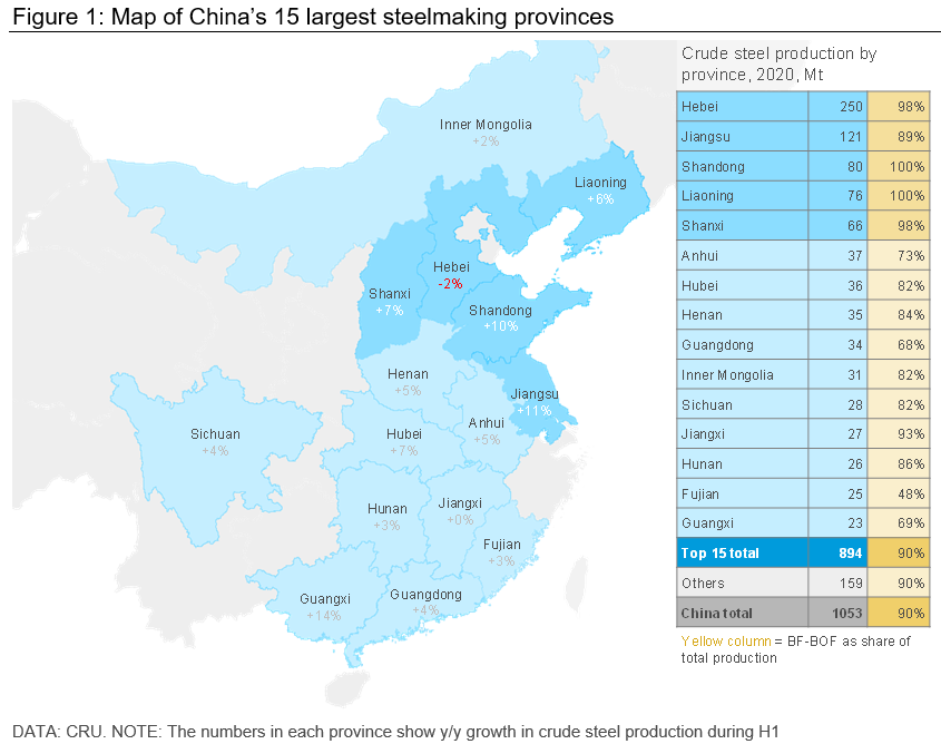 Despite the government’s desire to cut steel output, Chinese crude steel production in 2021 H1 was 64 Mt higher than in 2020 H1. Apart from Tianjin municipality and Hebei province, all provinces and municipalities with steel capacity in China saw crude steel production growth in H1. Among them, Guangxi province was the largest contributor, producing ~9 Mt of additional crude steel y/y that was primarily due to new capacity commissioning including the Fangcheng Port project belonging to Liuzhou Iron & Steel. Jiangsu province ranked second with crude steel production growth of ~7 Mt, equivalent to 11% of the country’s total growth, followed by Shandong province (+6 Mt), accounting for 10% of total growth. Shanxi and Hubei province were tied for the fourth place (+5 Mt) and in the remaining 23 provinces and municipalities, 15 of them saw y/y production growth exceeding 1 Mt.