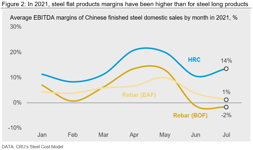Regarding the last point, it usually takes months for the central government’s target to be outlined and distributed to local governments before any actions are taken. Given this, steel end-users believed steel production would fall in 2021 H2, so they brought forward their purchases to 2021 H1. This reinforced already strong demand that lifted steel margins, which consequently encouraged steelmakers to maximize production before any government-led cuts are implemented.