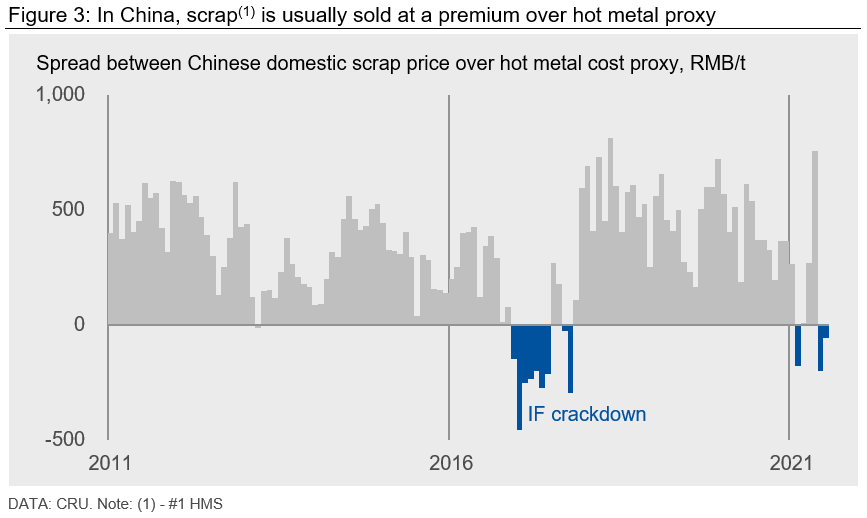 - Scrap having cost disadvantages relative to hot metal given China’s development stage: As scrap generation remains constrained in the current development stage of China, Chinese domestic scrap has always been sold at a premium over hot metal costs with a few exceptions in 2017 and recently in 2021.