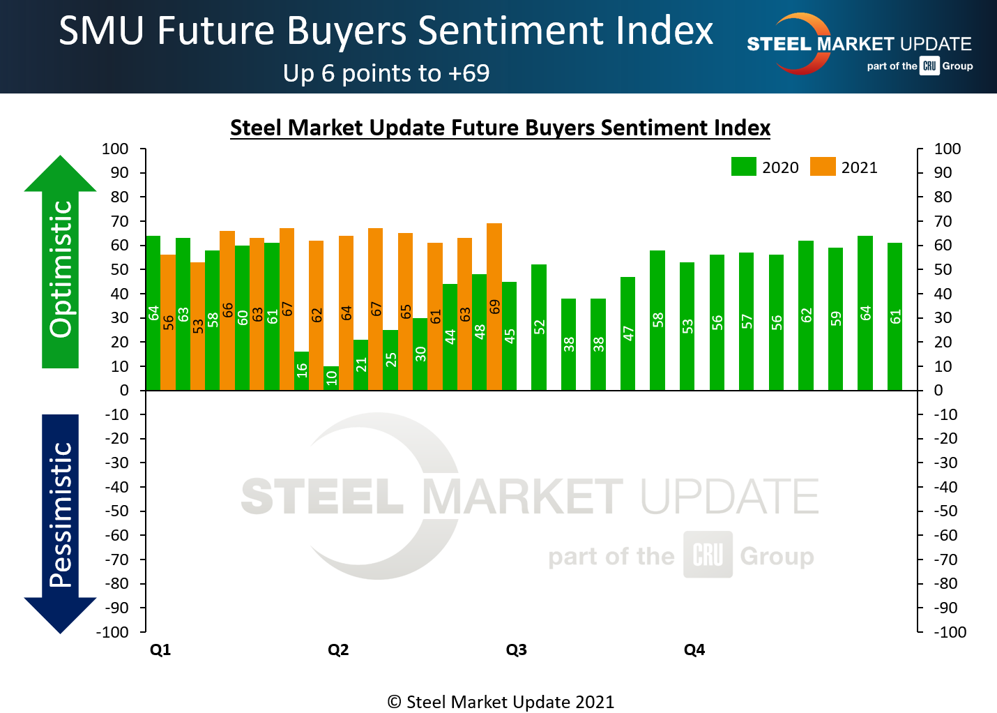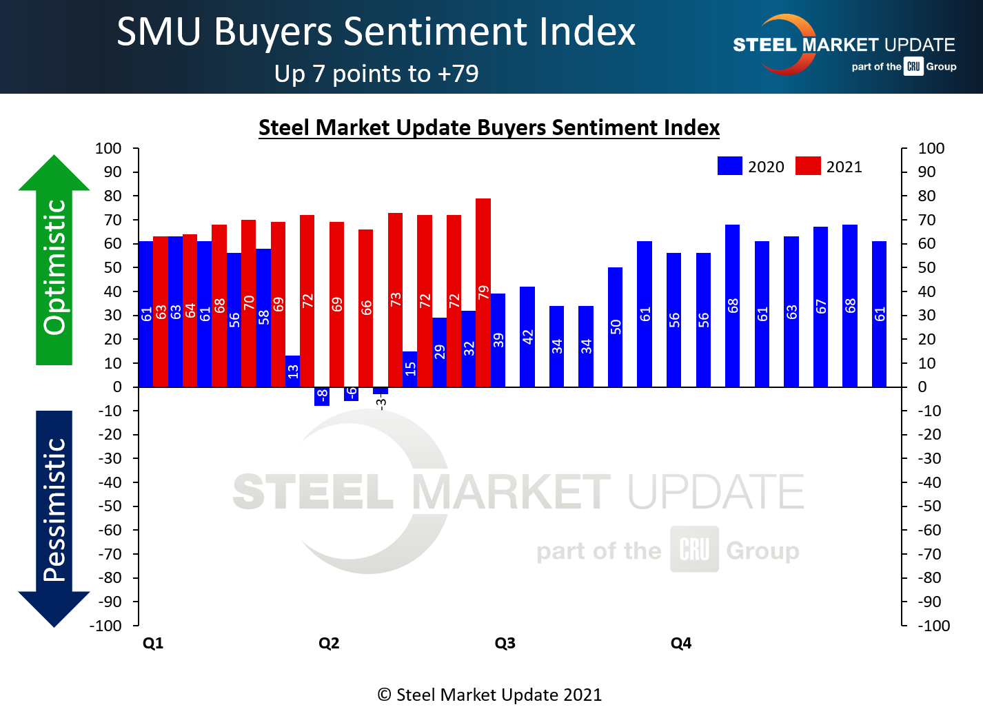 SMU Steel Buyers Sentiment Index is a measurement of the current attitude of buyers and sellers of flat-rolled steel products in North America regarding how they feel about their company’s opportunity for success in today’s market. It is a proprietary product developed by Steel Market Update for the North American steel industry.