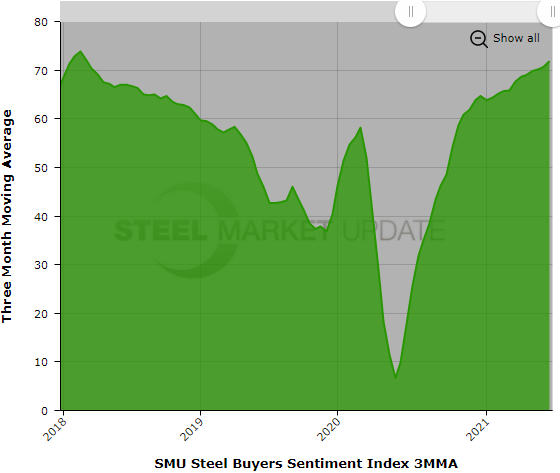SMU asks steel buyers every two weeks how they view their company’s chances for success in the current environment and how they view their prospects three to six months in the future. SMU’s Current Buyers Sentiment Index stands +79 this week, up from +72 two weeks ago and narrowly besting the previous high of +78 in mid-January 2018. SMU’s Future Sentiment Index jumped to +69, up from +63 two weeks ago and marking the highest point since +77 in early February 2018. Both indices have been in the +60s and +70s for most of the year–a massive recovery from the negative territory charted in the second quarter of 2020 following the outbreak of the COVID-19 pandemic.