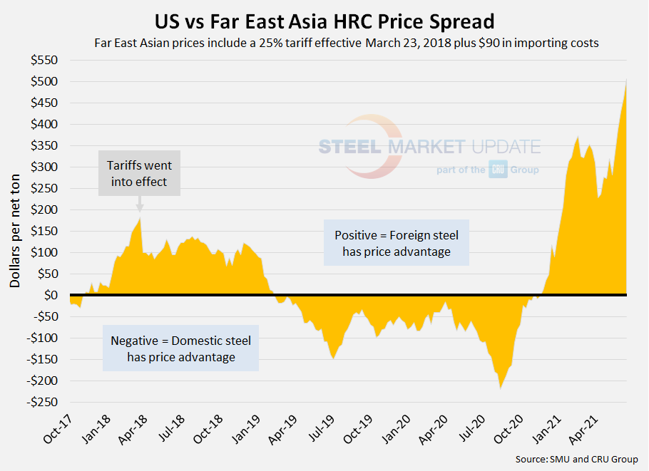 As of Wednesday, June 16, the CRU Far East Asian HRC price remained steady over the previous week at $898 per net ton ($990 per metric ton), up $18 per ton from two weeks prior. Adding tariffs and import costs, the delivered price of Far East Asian HRC to the U.S. is $1,213 per ton. The latest SMU hot rolled price average is $1,720 per ton, up $45 over last week and up $100 from two weeks prior. Therefore, U.S.-produced HRC theoretically is now $507 per ton more expensive than imported Far East Asian HRC, up from $462 last week, and up from $430 two weeks ago. This spread has reversed its course over the last few weeks, as the potential discount held by Far East Asian HRC imports shrank from mid-February through mid-April. This is now the largest theoretical spread between Far East Asian and domestic HRC prices in our four-year history. Prior to 2021, the previous record high was $183 in March 2018.