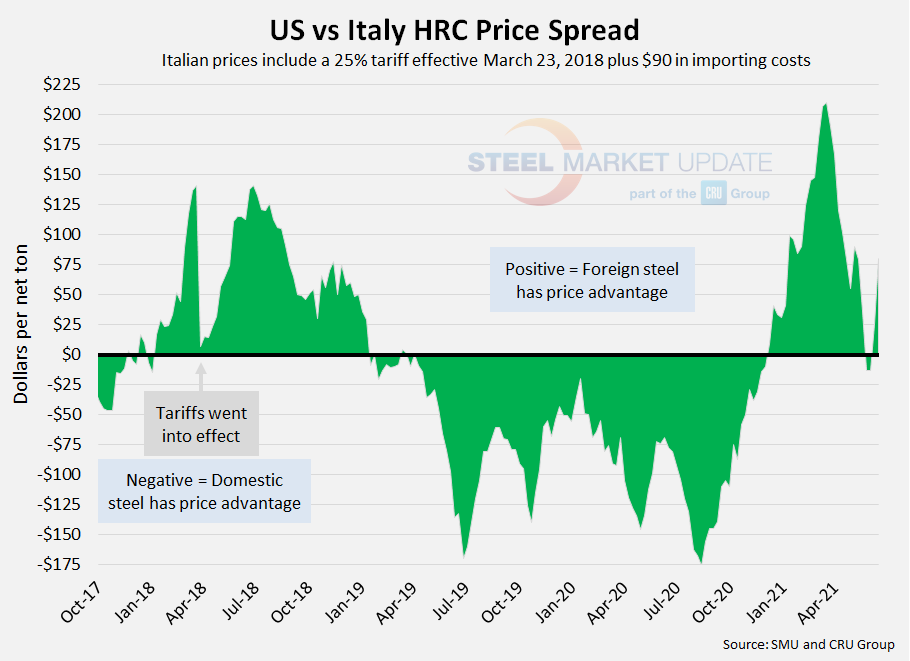 The spread between foreign and domestic steel prices has changed direction again since our last update, according to our latest foreign versus domestic hot rolled steel price comparison. The price differentials (after taking freight costs, trader margins and tariffs into consideration) between domestic HRC and foreign imports had surged from February to March of this year, reaching record highs in favor of foreign producers. The German and Italian HRC price spreads then shrunk through April and May, while Far East Asian HRC held a strong advantage over domestic prices. Over the past two to three weeks, the price spreads for all three regions have begun to rise again in favor of foreign producers.