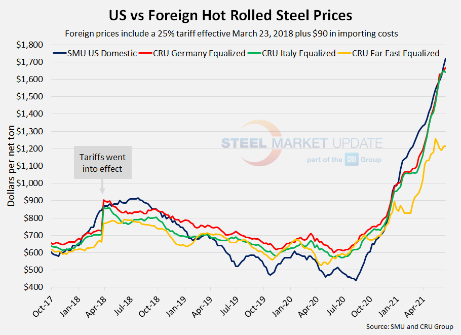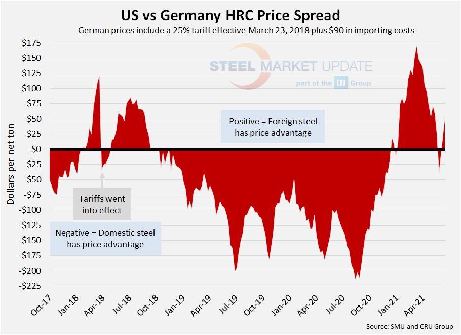 The following calculation is used by Steel Market Update to identify the theoretical spread between foreign hot rolled steel prices (delivered to U.S. ports) and domestic hot rolled coil prices (FOB domestic mills). This is only a “theoretical” calculation as freight costs, trader margins and other costs can fluctuate, ultimately influencing the true market spread. This compares the SMU U.S. hot rolled weekly index to CRU hot rolled weekly indices for Germany, Italy and Far East Asian ports.