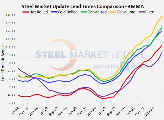 For comparison, the 3MMA for hot rolled was 3.56 weeks, cold rolled 5.44 weeks, galvanized 5.69 weeks and Galvalume 5.89 weeks at this time last year, while plate was at 3.87 weeks. In other words, lead times remain more than twice as long as they were in June 2020 when the economy was just beginning to move past the COVID disruptions.