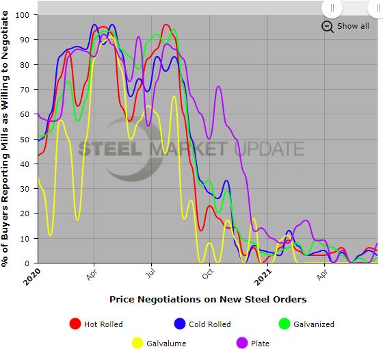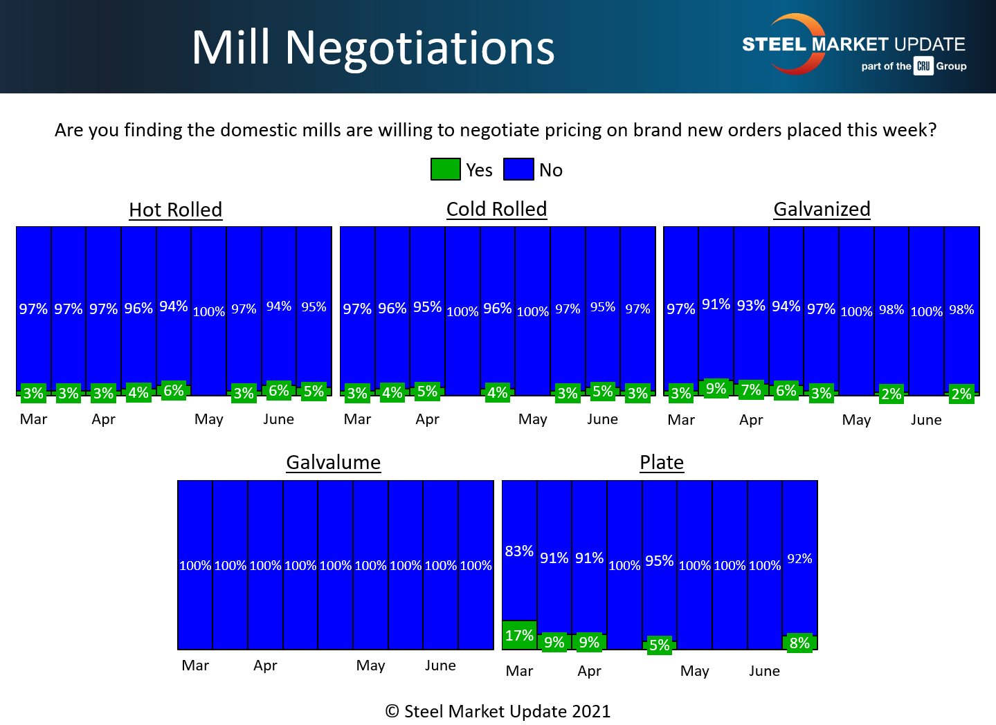 Lead times are an indicator of steel demand—the longer the average lead time, the busier the mills. As the lead times above indicate, the mills are extremely busy and have no need to discount prices to sell all the material they can make. Almost none of the respondents to this week’s survey reported any mills willing to talk price. “Absolutely not. There are zero negotiations going on, and I don’t blame the mills at all,” said one buyer. “Just be happy if you get a quote back,” said another. “We’re mainly looking offshore, but they aren’t negotiating either,” added a third.