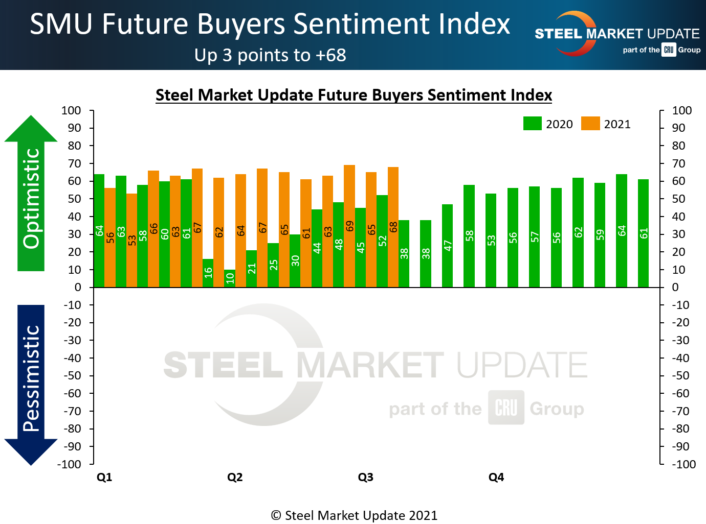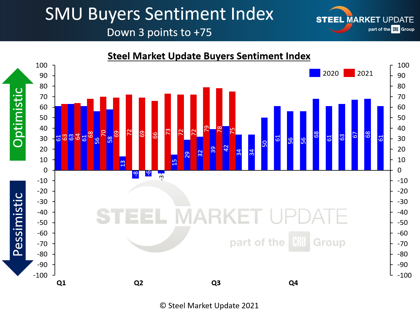 SMU Steel Buyers Sentiment Index is a measurement of the current attitude of buyers and sellers of flat-rolled steel products in North America regarding how they feel about their company’s opportunity for success in today’s market. It is a proprietary product developed by Steel Market Update for the North American steel industry.