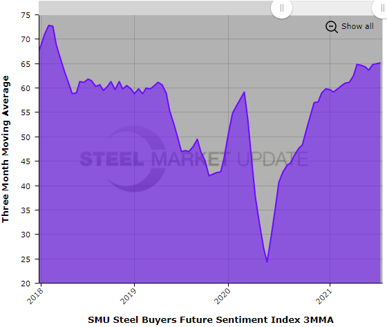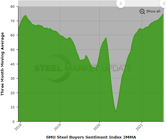 Steel buyers’ sentiment, as measured by Steel Market Update, remains extremely optimistic, and hasn’t seen a change of any real significance in the past three months. Current Sentiment has averaged a reading of +75 and Future Sentiment an average of +65, plus or minus a few points, since late April as the market enjoys the rush of record-high steel prices and profits.