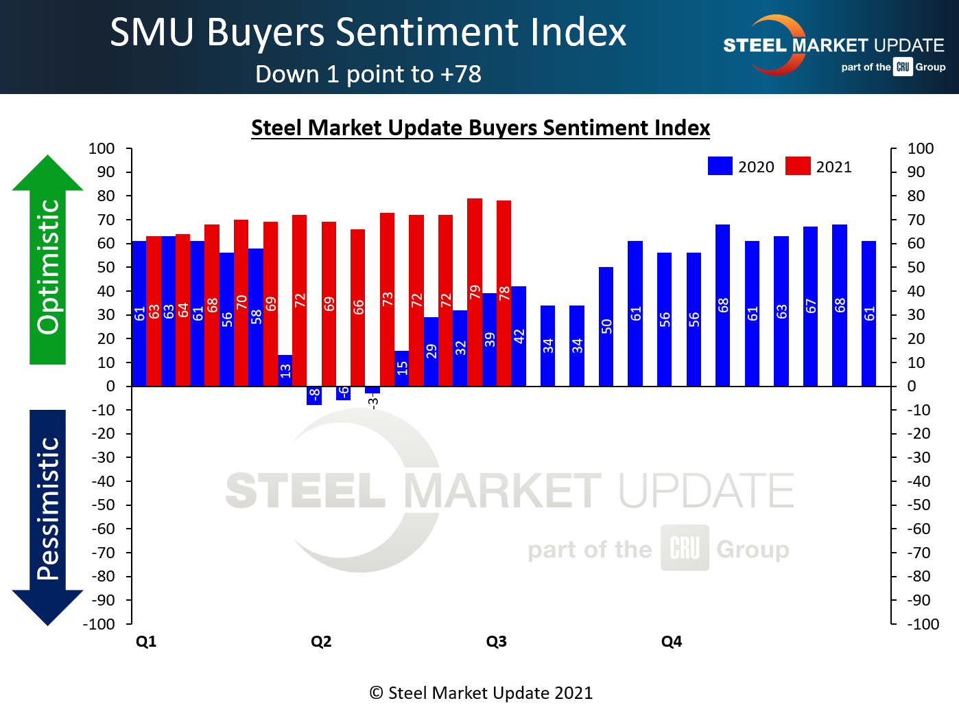 Steel buyers’ sentiment saw a slight dip in the past two weeks but remains near record highs, in line with record-high steel prices and profitability.